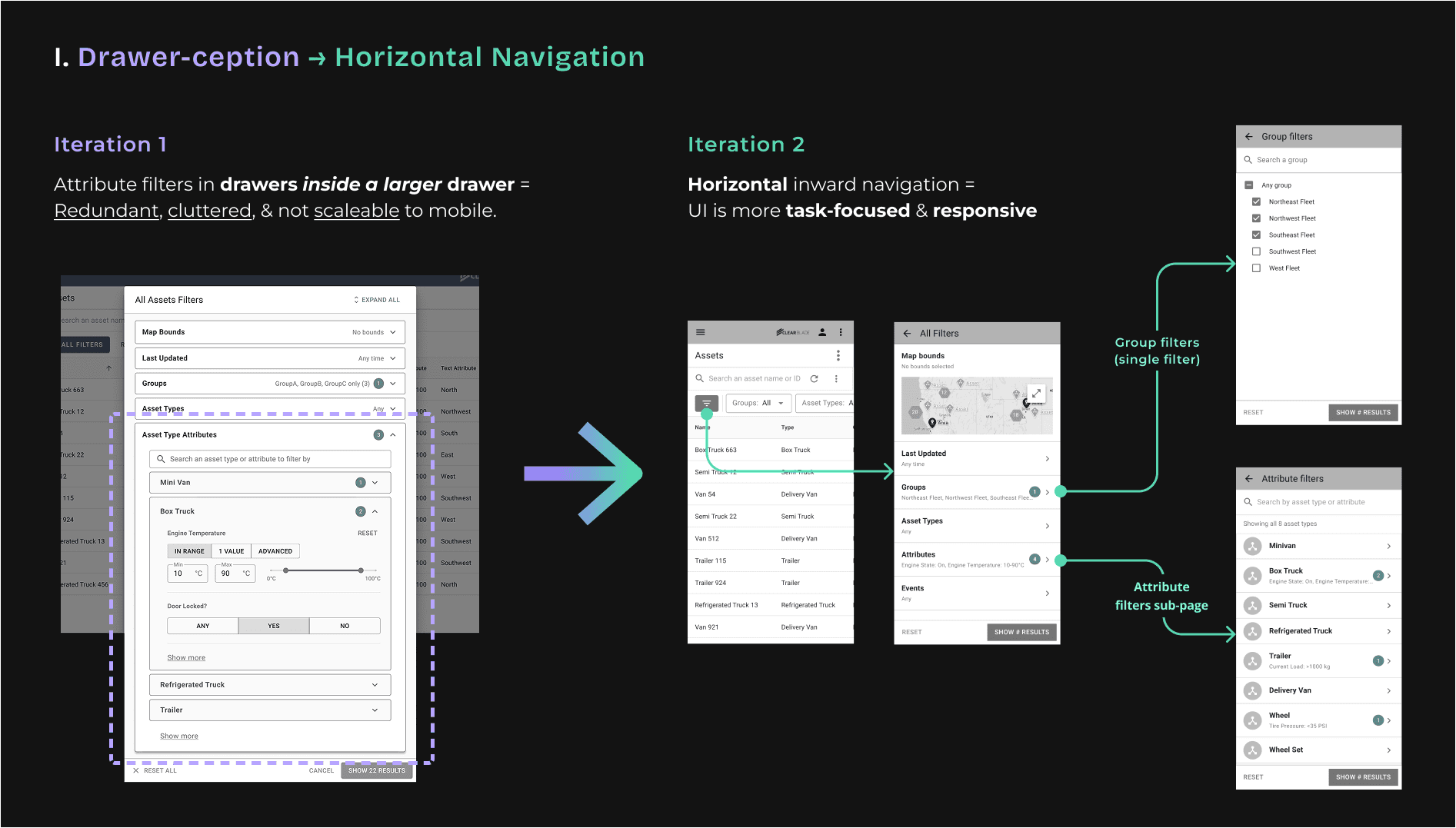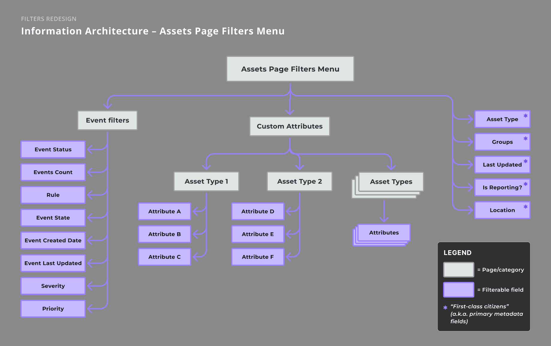 The old filters menu didn't provide much context as to which asset types an attribute filter belonged to, which especially became a problem when there were dozens or even up to a hundred different filter fields that could appear in the Asset filters menu (most of which were for custom data attributes on asset types). We diagrammed the information architecture of the Assets page (and its associated filterable data) to help our team–and our stakeholders–visualize the relationships better. Our plan was to match the Assets filters menu's information architecture to its real underlying data structure.
