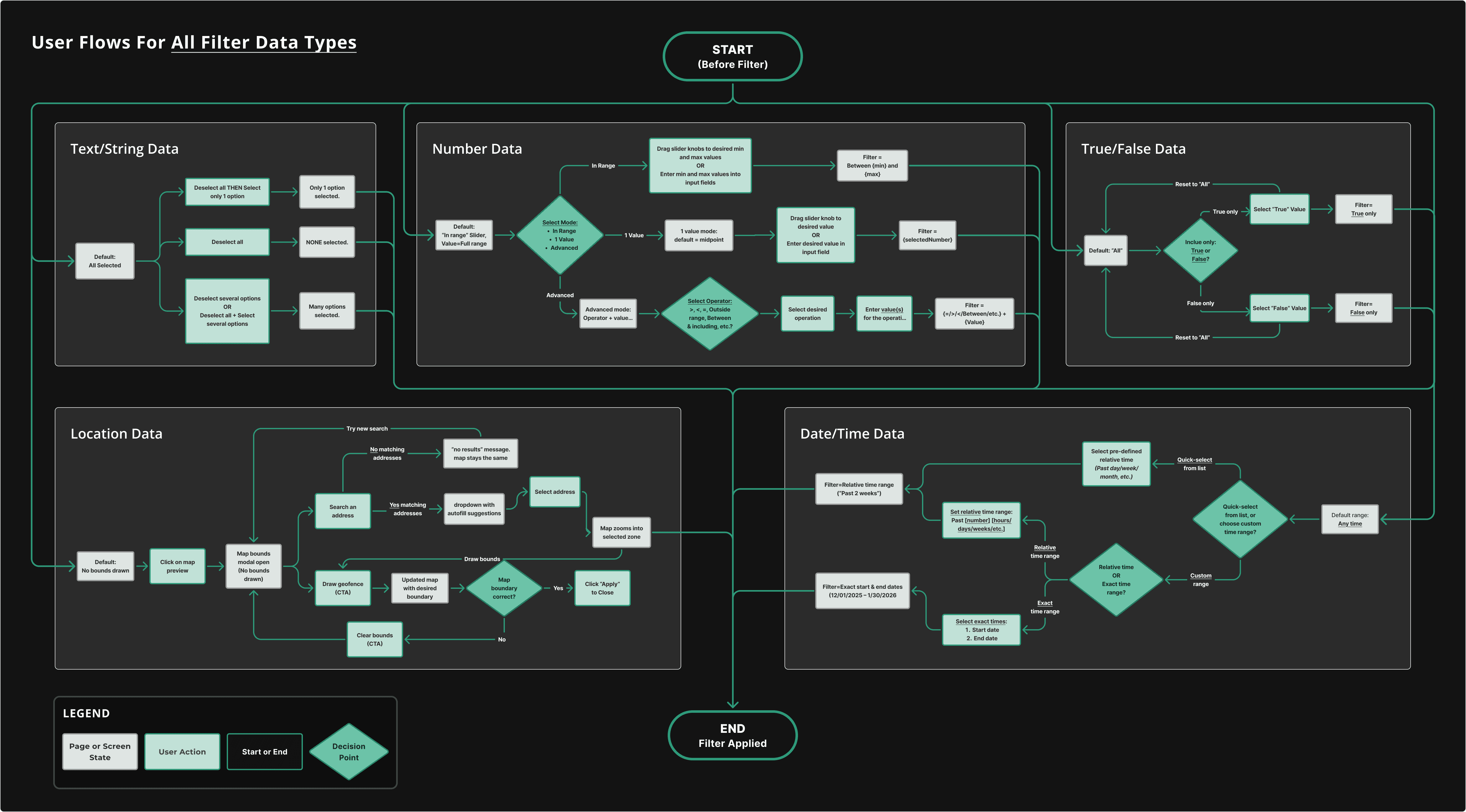 For each data type, we mapped all the posssible flows and component states that we would need to account for in the final designs, so as to ensure 1. All core business requirements were being met for each filter field, and 2. Users wouldn't find themselves stuck or unable to perform certain functions while interacting with a particular filter field.
