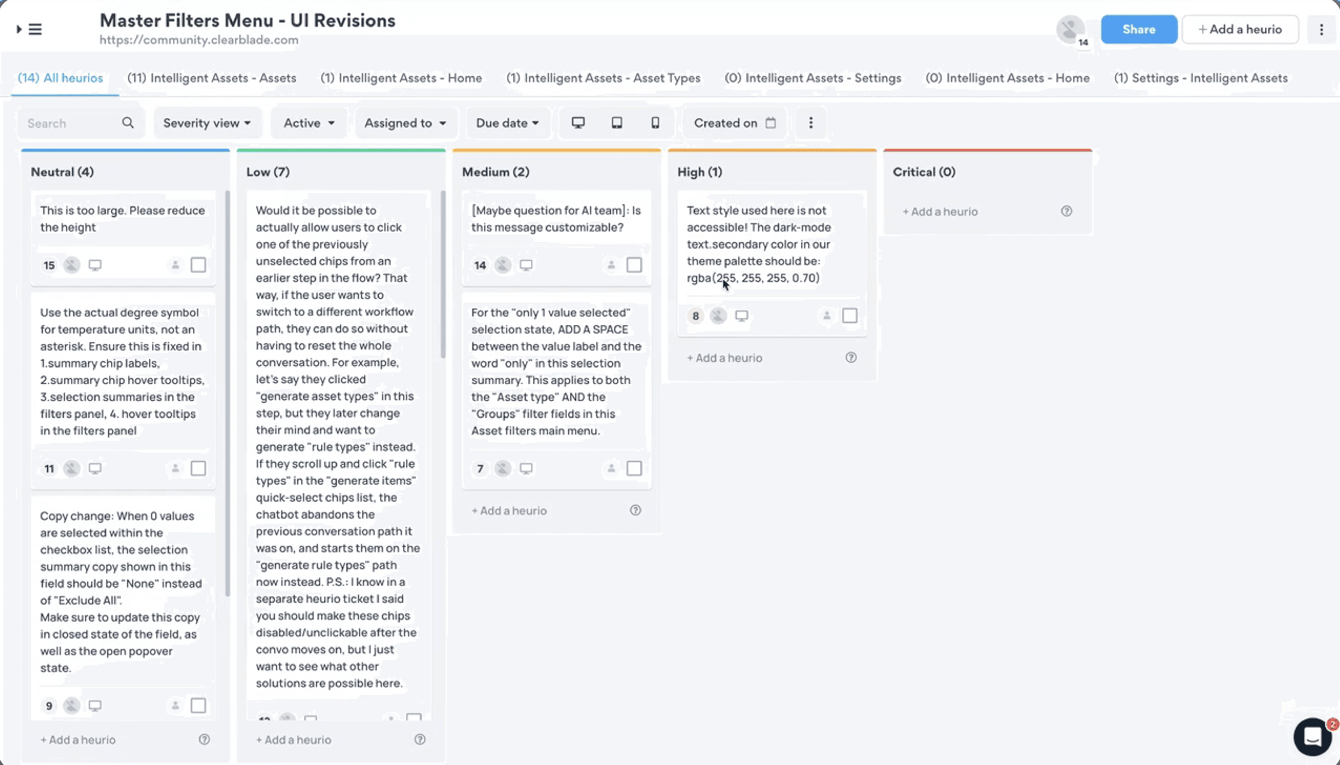 We used Heurio to conduct post-development QA, verifying alignment with design intent. Feedback was prioritized from "Neutral" to "Critical" so devs know which items to fix first.