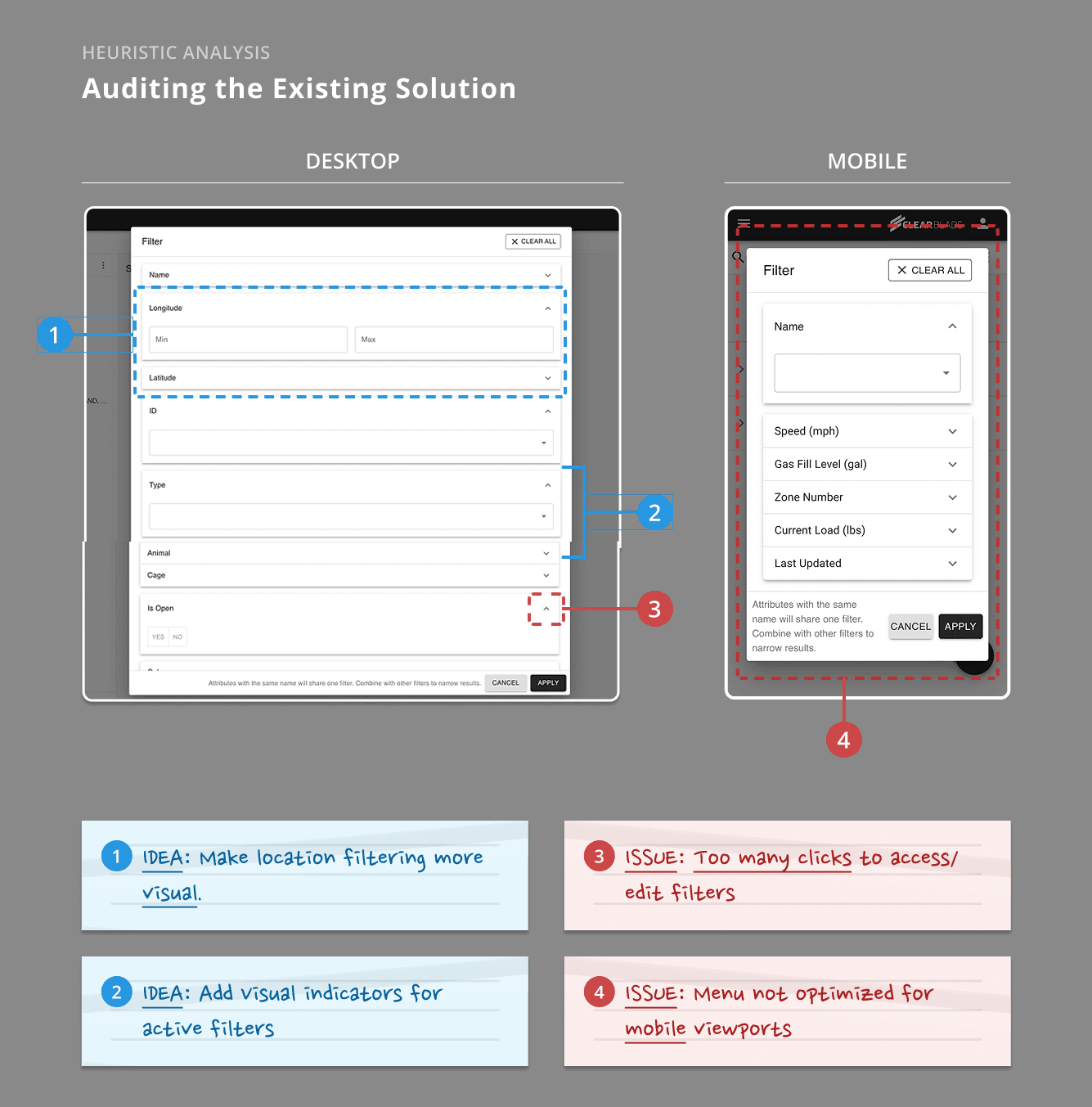 Next, we audited the Assets page's existing filters menu to understand the current gaps and usability issues, and identify potential opportunities for improvement.
