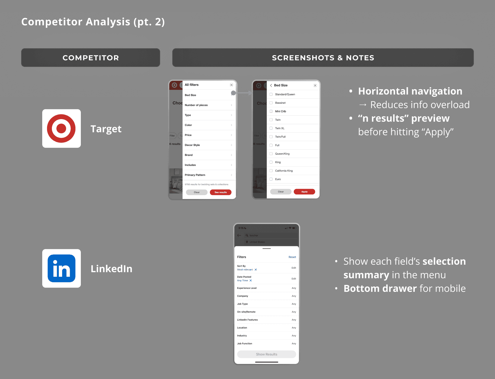 We took to the web to find direct and indirect competitors to take inspiration from for ideating our new filters menu.